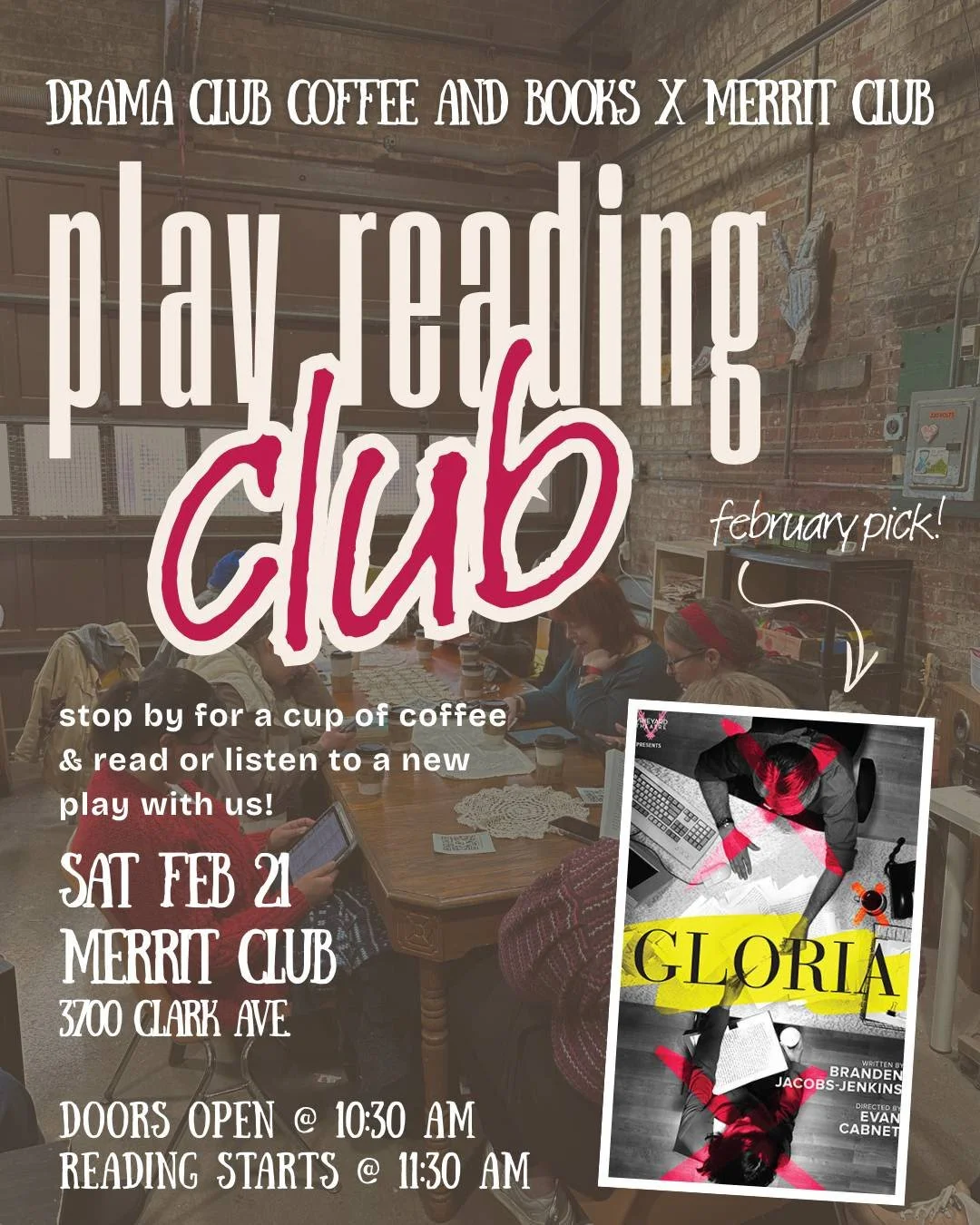 Join Drama Club Coffee & Books at Merrit Club for a read through of Gloria by Branden Jacobs-Jenkins