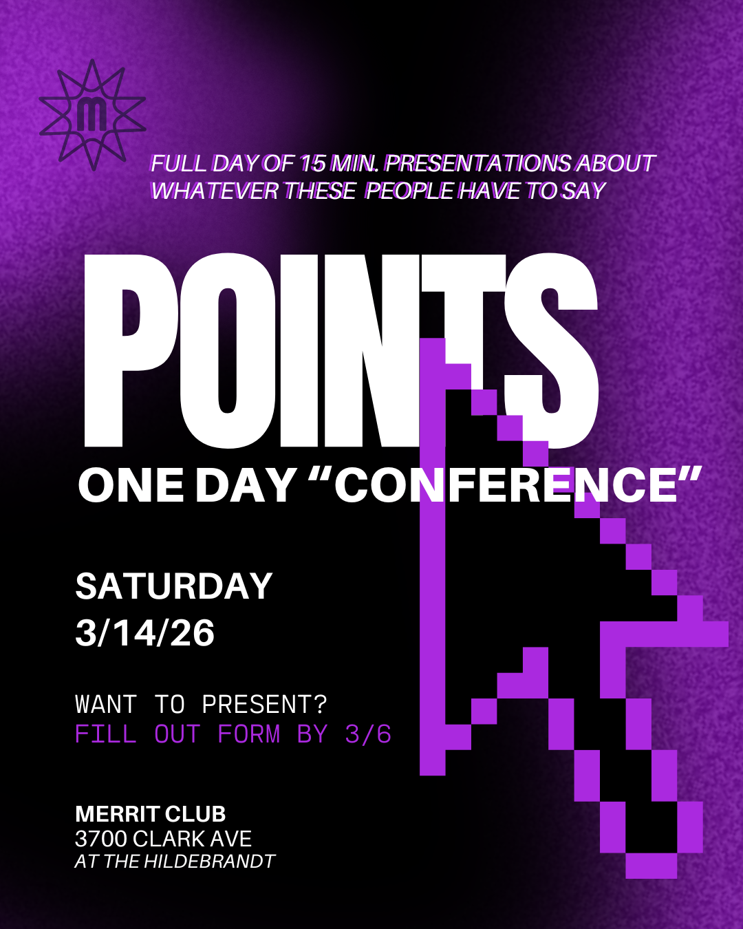 We'll have the projector set up and lanyards ready! Merrit club is hosting a conference-meets-presentation-party, so stop by to enjoy a full day of 15 min. presentations about whatever these people have to say.